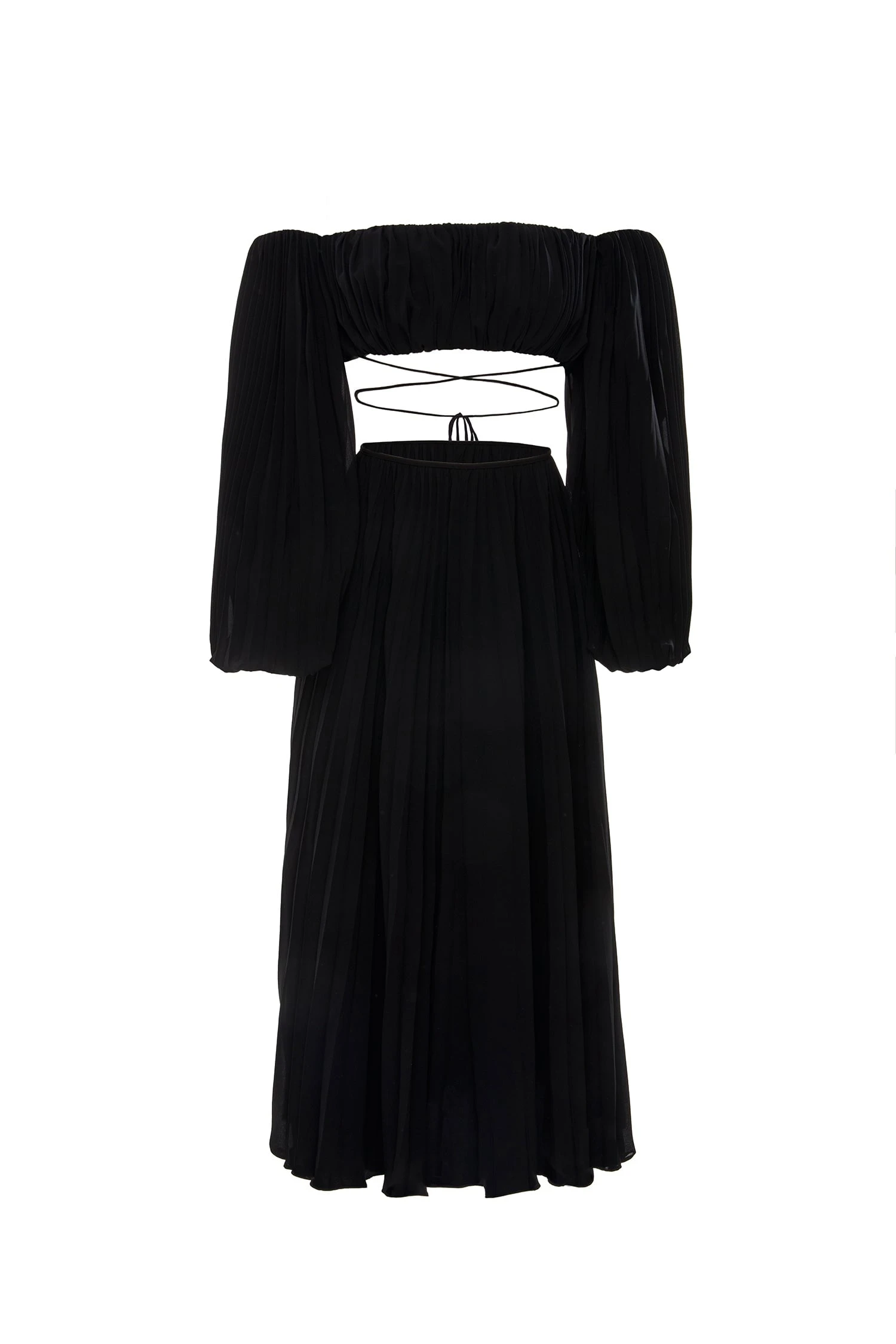 The Angelina Set embodies elevated resort wear with its pleated satin fabrication, criss-cross waist tie, and off-shoulder blouson sleeves. Separated at the waist, this skirt features a side slit and free-falling silhouette that sways with each step.