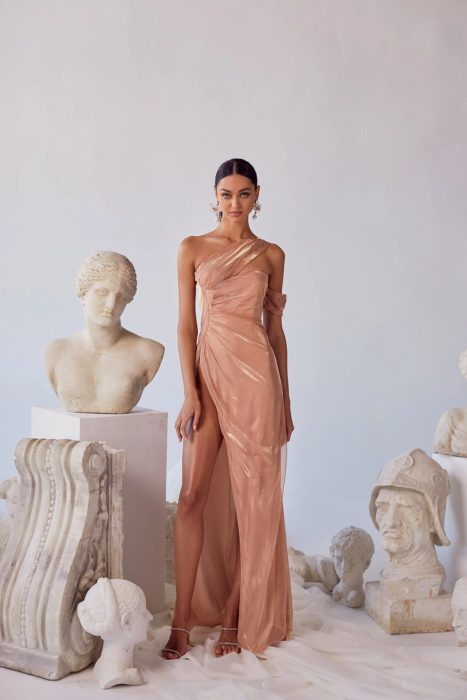 Channeling Aphrodite as our muse, the Beatrice Gown inspires you to emulate beauty and confidence. Constructed from an iridescent nude fabric with pink undertones, draped from the waist to an asymmetrical off-shoulder, then completed with a thigh-high slit for the ultimate statement. The Beatrice Gown embodies all things romance.