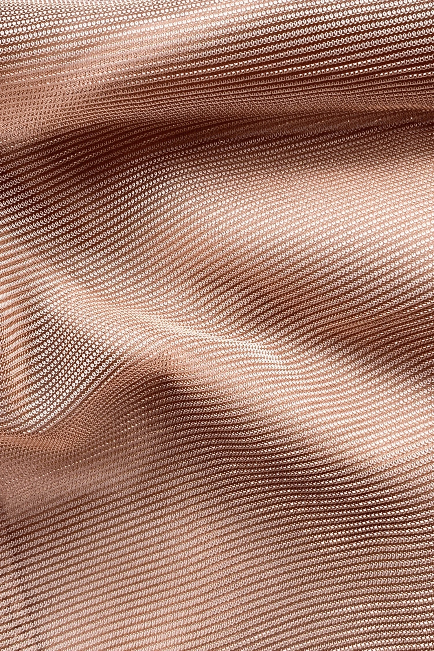 Nude with pink undertones, Non-sheer, Iridescent mesh fabric, Satin lining, Non-adjustable sleeves, Right leg high slit, Sleeve sits off right shoulder