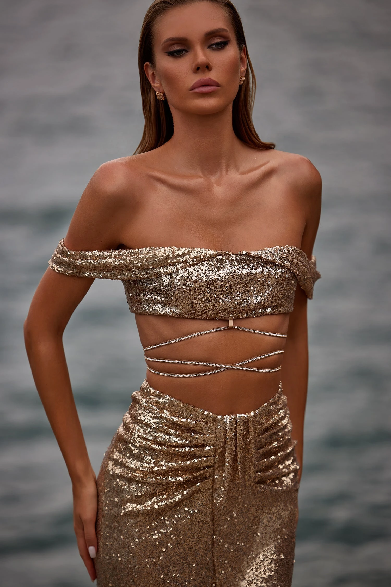 Sequin fabric, stretchy, off-shoulder sleeves, diamante embellished waist ties, waist ties come detached and can be hooked through the loop at the bottom of the crop, no cups, zip back, lined, elastic waistband on skirt & crop.