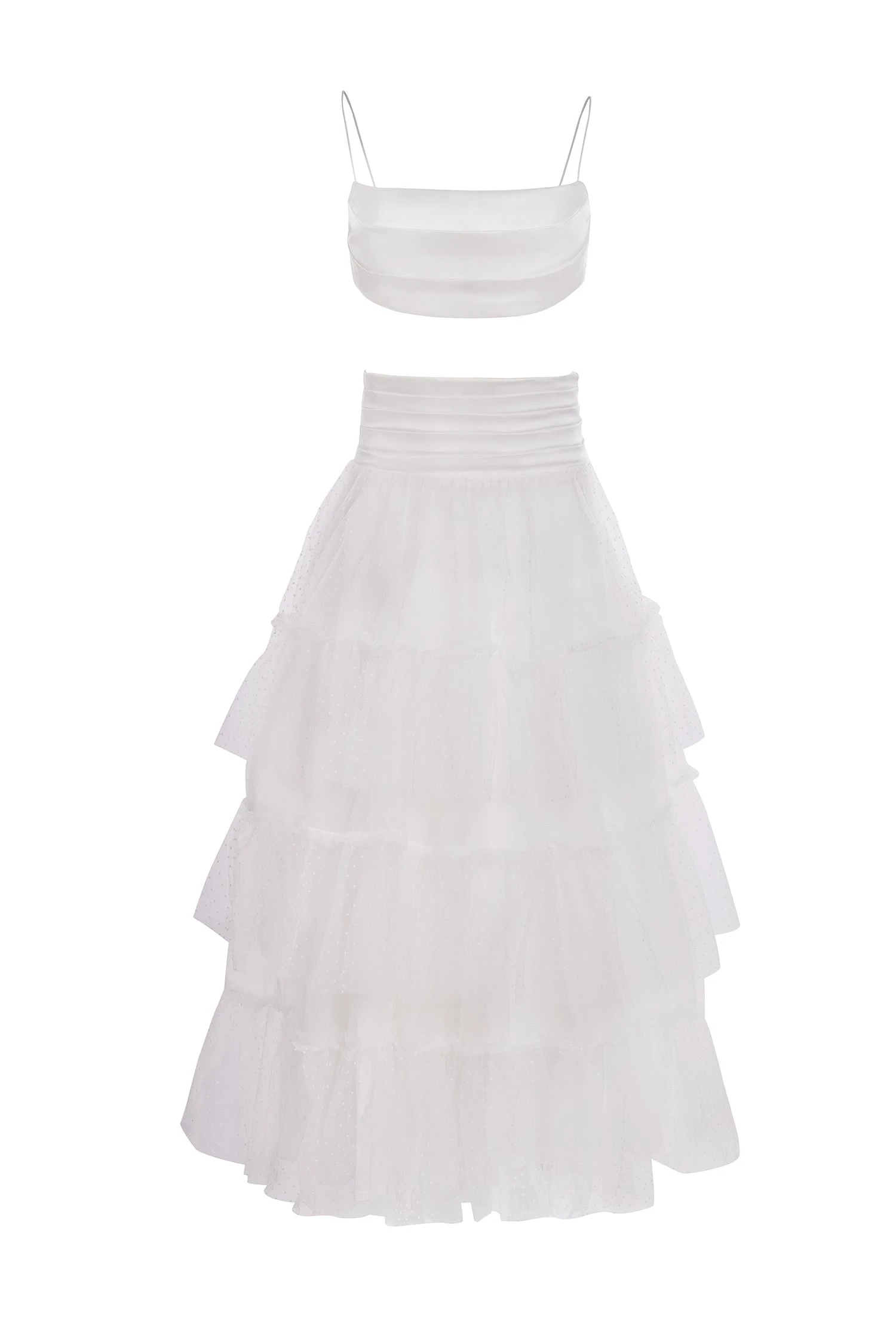 Matte satin fabric, polka dot tulle mesh fabric, slight stretch, lined, elastic dainty straps, no cups, back zip, pleated waistline on skirt, pleated crop (crop top length 10.5cm, pleats fall over the crop to a length of 15cm).