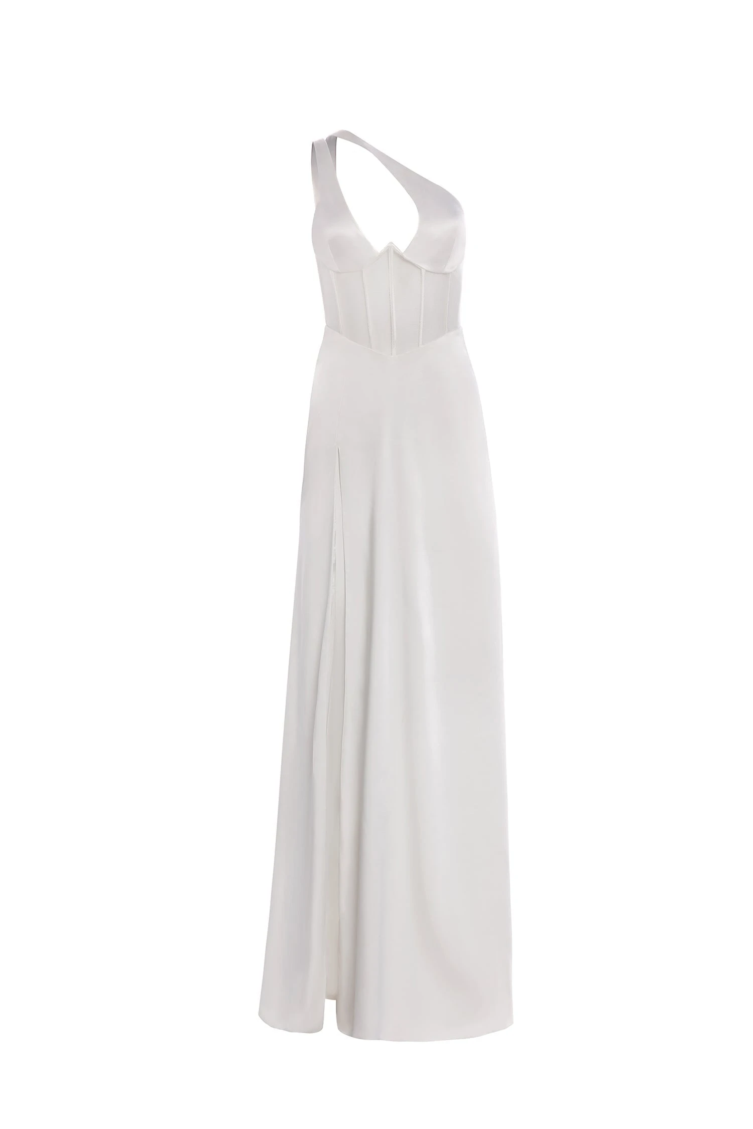 Favor asymmetry with the Maliha Gown. Featuring a diagonal neckline with an exposed bust, sheer mesh bodice, and side slit. Fitted at the hips & falling to a straight silhouette, this soft satin style is so stylish.