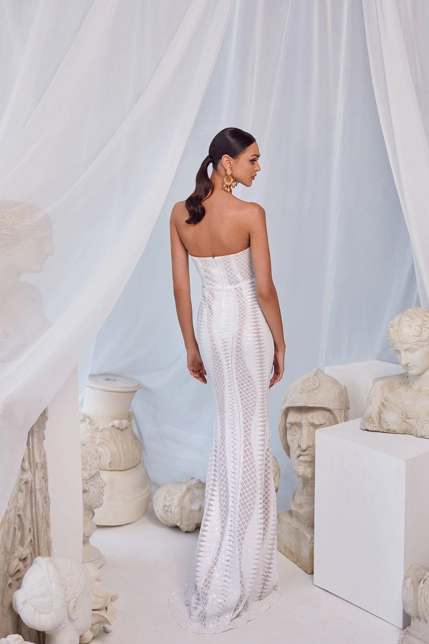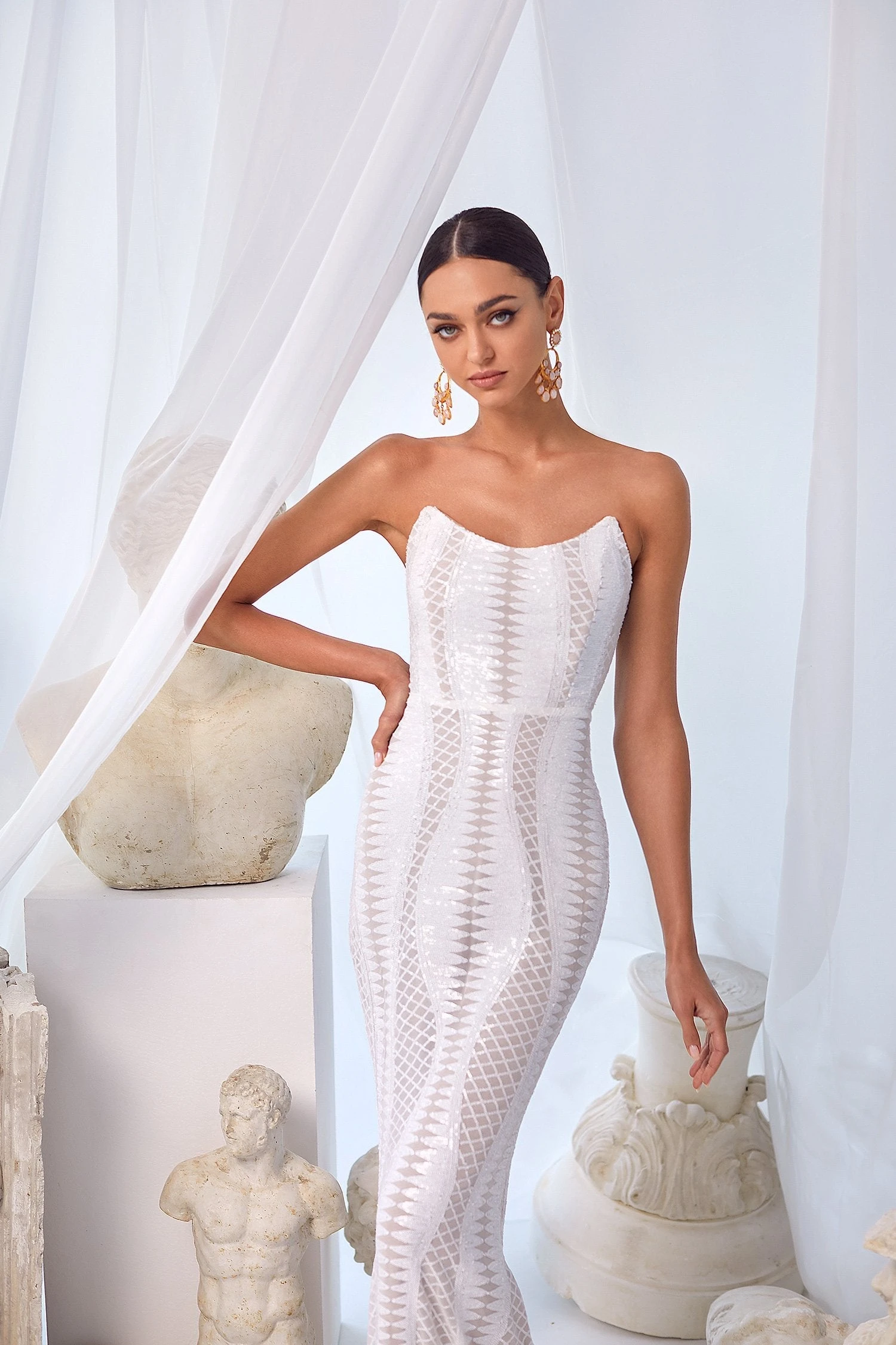 Enduringly elegant, the Nora Gown exemplifies the true meaning of understated style. With a classic scoop neck, figure-skimming silhouette, and white/nude sequin fabric, this gown is every minimalistic woman’s dream.