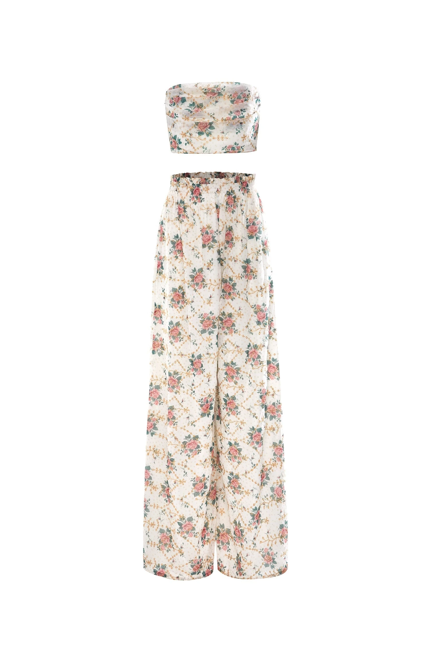 This two-piece design welcomes spring with its floral pattern, airy fabrication, and relaxed fit. The Samar Set features a ruched bustier, dainty frill trims along the pant waistband, and a feminine bow tie back.